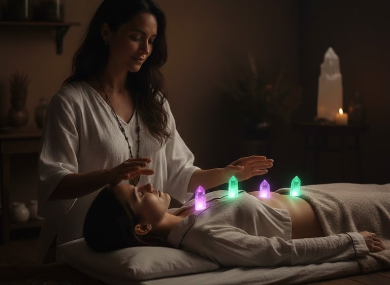 A sessão de harmonização dos chakras é um alinhamento vibracional profundo que utiliza cristais, toques sutis ou emissão de energia para remover obstruções nos seus centros de força, restaurando o fluxo vital e o equilíbrio perfeito entre corpo, mente e espírito.